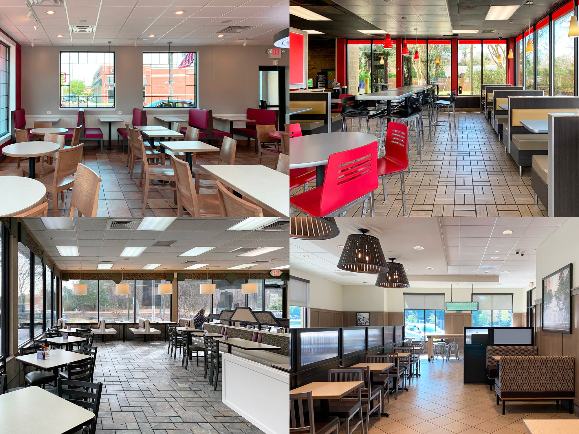Если все сети портят свои интерьеры по всем трем категориям, они становятся одинаковыми. Ниже несколько сетевых заведений, из интерьеров которых я намеренно убрал брендинг — попробуйте угадать где тут «Макдоналдс», KFC, «Бургер Кинг» и Chick-fil-A (правильные ответы — в конце статьи). Не нужно быть экспертом в архитектуре, чтобы понять что все это плюс-минус одно и то же.