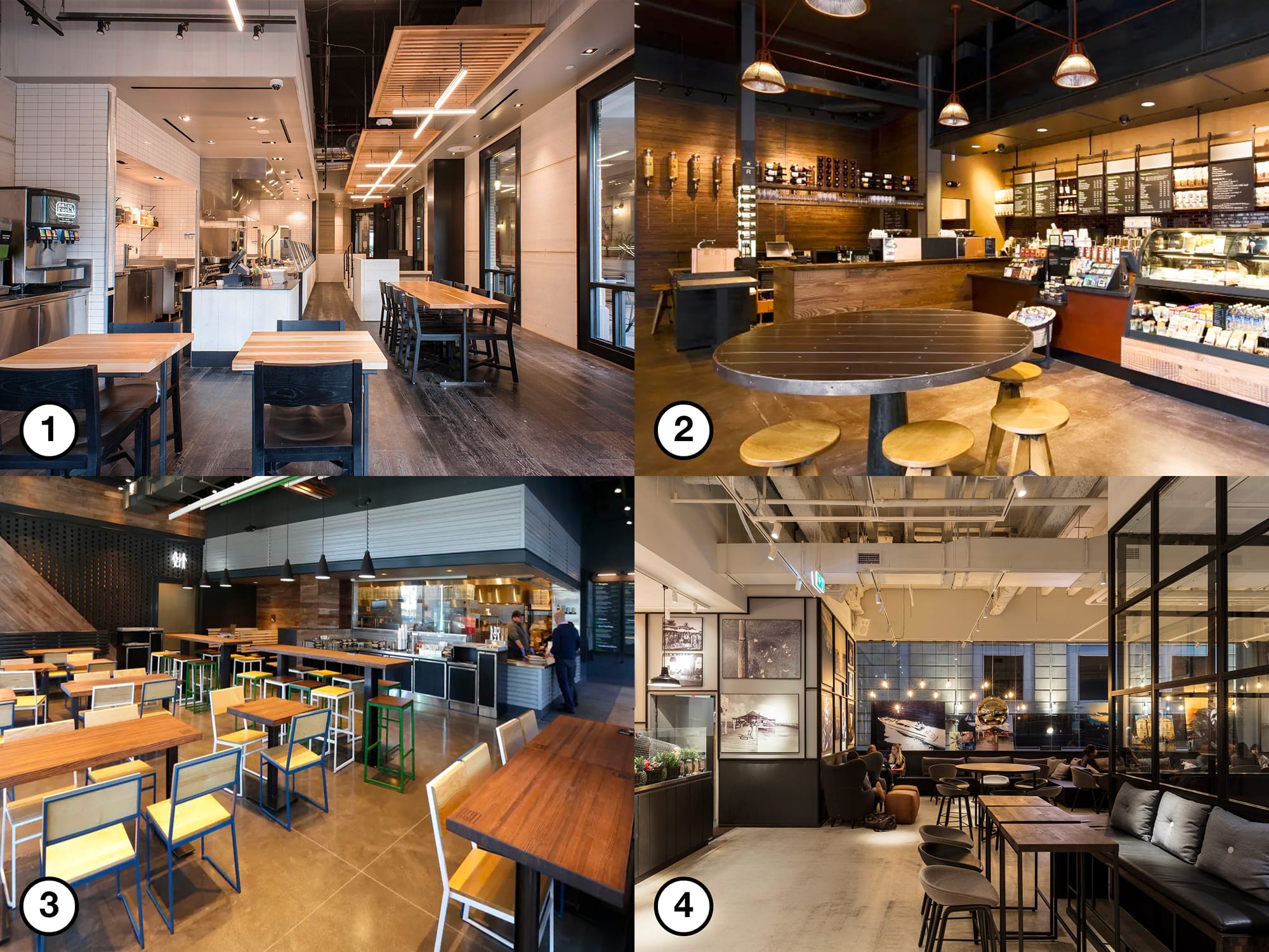 Давайте сравним интерьеры по уже отработанной схеме убрав брендинг. Принципиальное отличие этого набора интерьеров от предыдущего коллажа — больше натуральных материалов, улучшенное освещение и более уютная цветовая гамма. И тем не менее, попробуйте угадать где здесь «Старбакс», Shake Shack, Joe & The Juice и Cava (времен до Project Soul) — ответы будут в конце статьи. Вроде у всех нормально — но у всех одинаково. Своей одинаковостью эти интерьеры слаженно работают на потерю идентичности каждым из брендов.